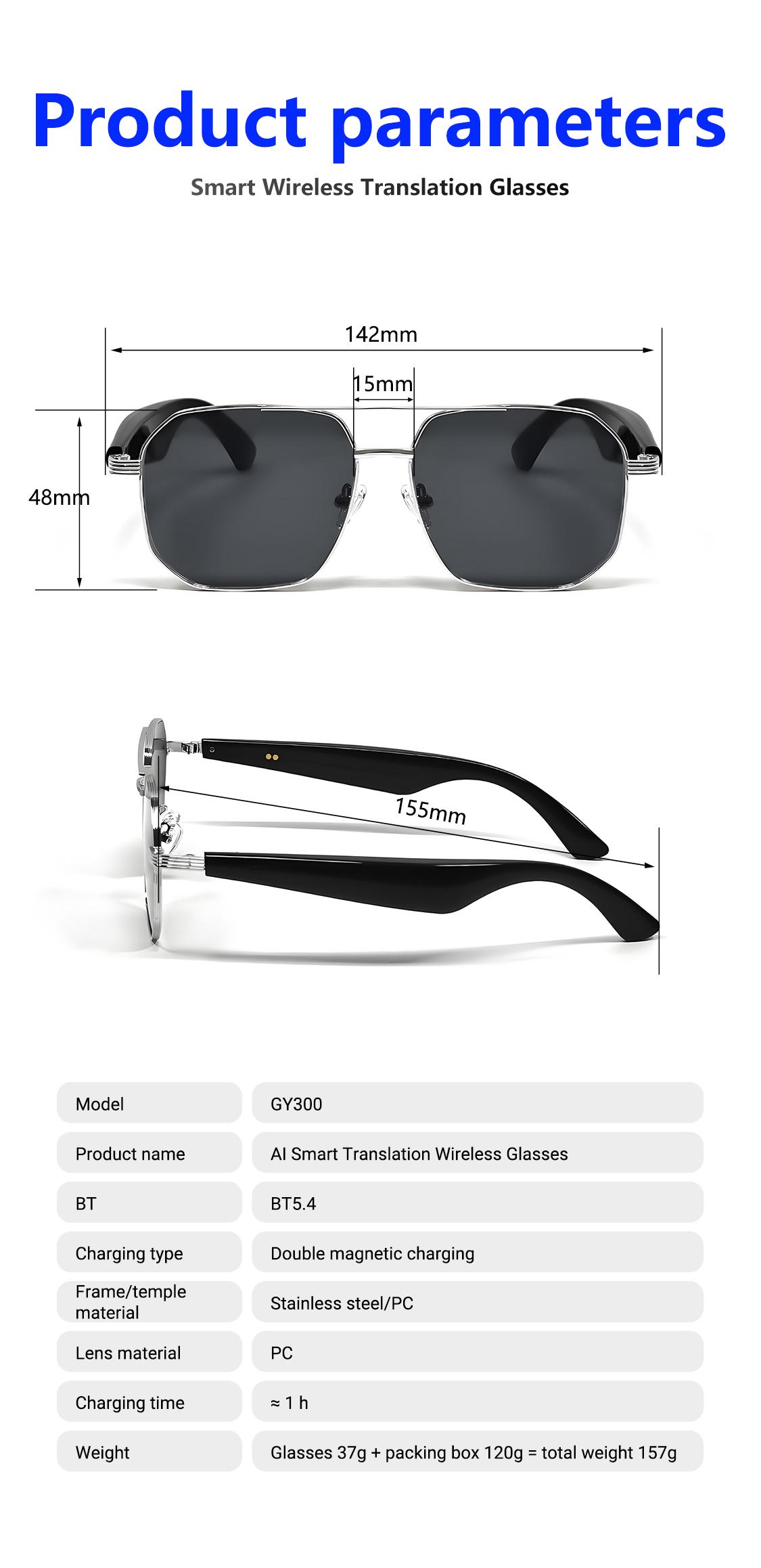 *AI Bluetooth Audio Call Fashion Smart Glasses: Equipped with functions such as AI intelligent voice and video real-time translation, AI dialogue and Q&A, AI intelligent translation (including translator mode and the translation mode combining glasses and mobile phone, which can customize the translation of more than 163 languages)