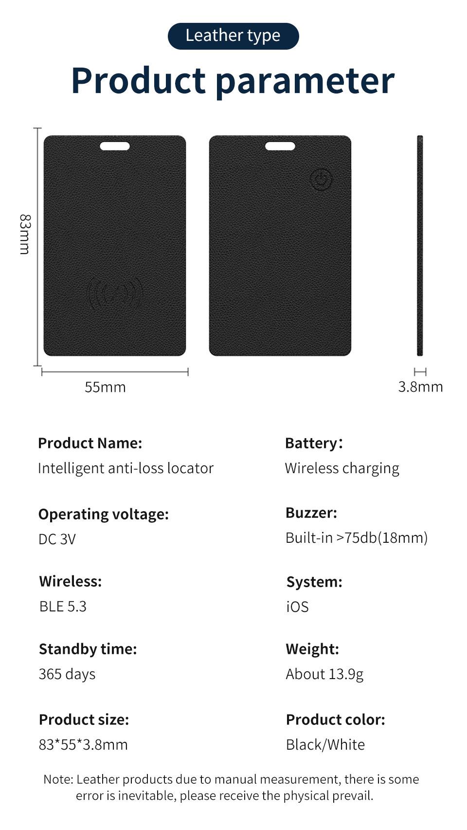【Lost Mode: Turn on Lost Mode on the Find My Wallet tracker and enter your contact information in advance. Thanks to Apple's vast network of devices on Find My, anyone who finds your card can get your contact details through the "Identify Found Items" feature in the Find My app. When a device on the network finds your phone, your phone will automatically receive a notification. Product specifications: Color: Black/ White Material: ABS Size: 83*55*3.8mm Charging method: Wireless charging Applicable models: iPhone, MacBoock, iwatch, iPad APP: Find My (cannot be used on Android) Packing specifications: 1PC * Tracking card