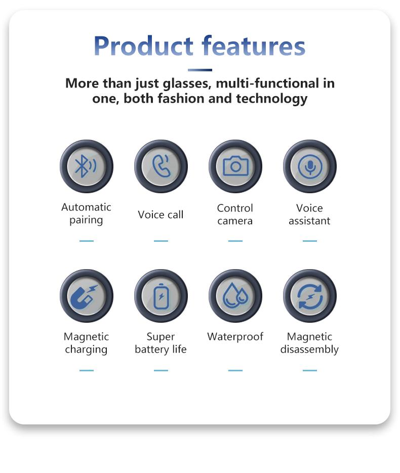 AI voice wake-up, AI photo recognition, AI intelligent question-and-answer interaction, AI smart translation, high-definition photography and video recording (with anti-shake function), recording, Wi-Fi transfer of photos, videos, and recordings to phone, slide to adjust volume, wear detection, dual microphone noise reduction, call noise reduction, intelligent voice assistant, Bluetooth calls, music playback (switch, pause music), low power consumption Jerry + Allwinner main control chip, long-lasting battery life, dual physical buttons plus slide touch for convenient operation, 39 grams lightweight overall weight for comfortable wearing, customizable sunglasses, blue light protection, color-changing, myopia, and other lenses, .