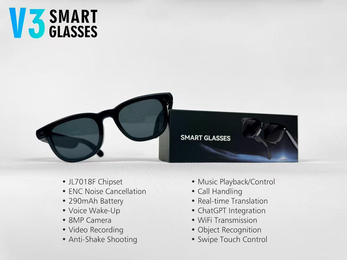 AI Smart Glasses V3 with 8MP Camera & ChatGPT. Features Bluetooth Call, Voice Wake-Up, Video Record & Music Play