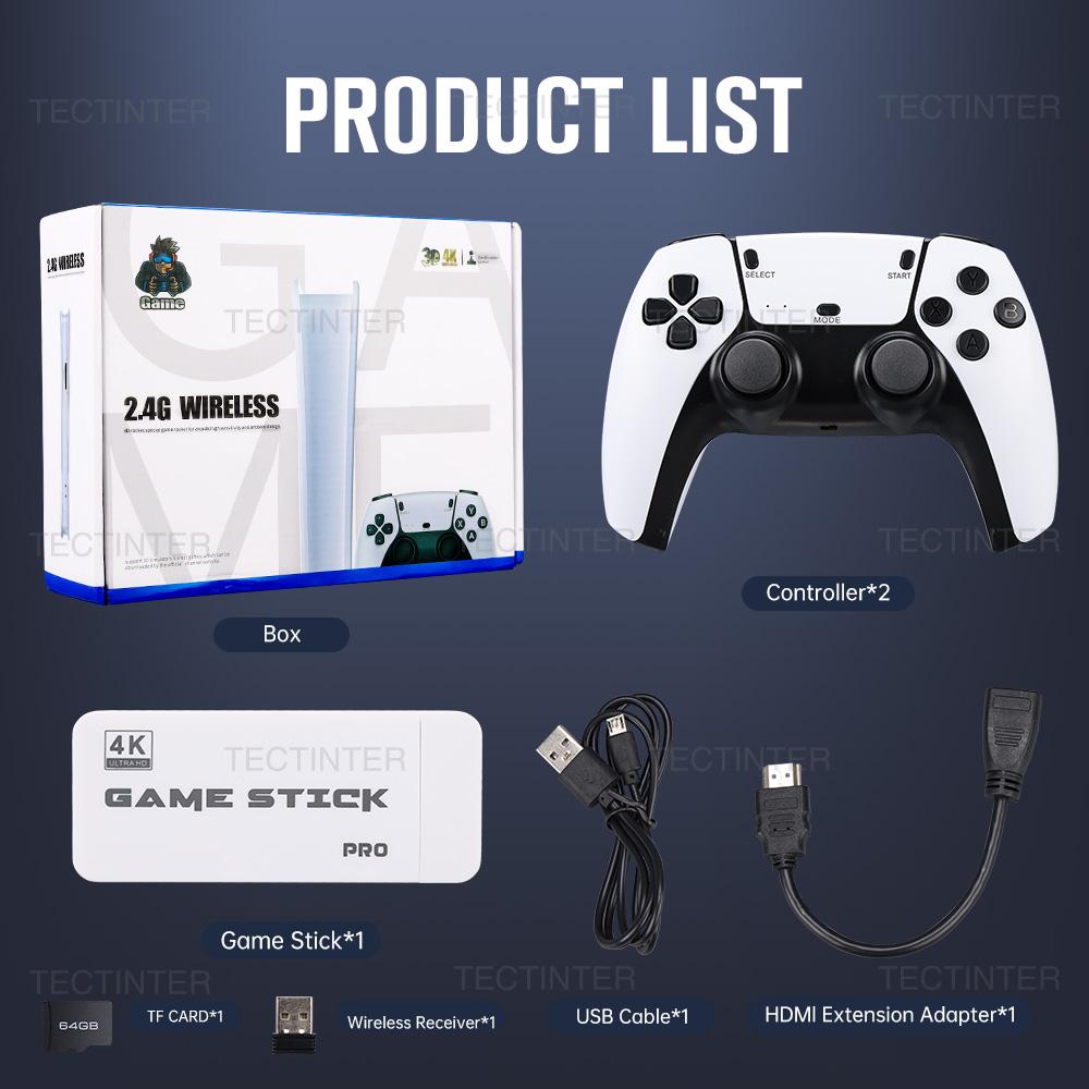 2 x Controllers 1 x Game Stick 1 x Signal Receiver 1 x USB Power cable 1 x HD Extension cable 1 x Manual 1 x Retail Box (Optional) TF card (optional) is included in the game stick