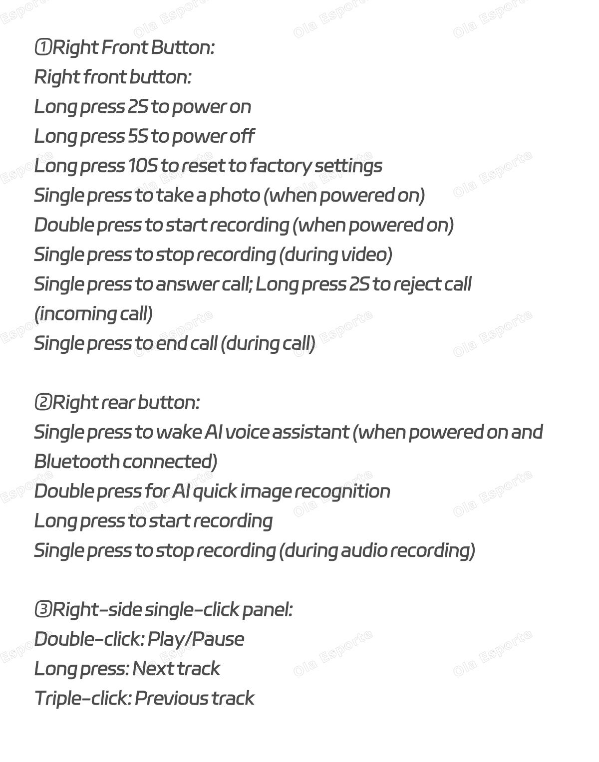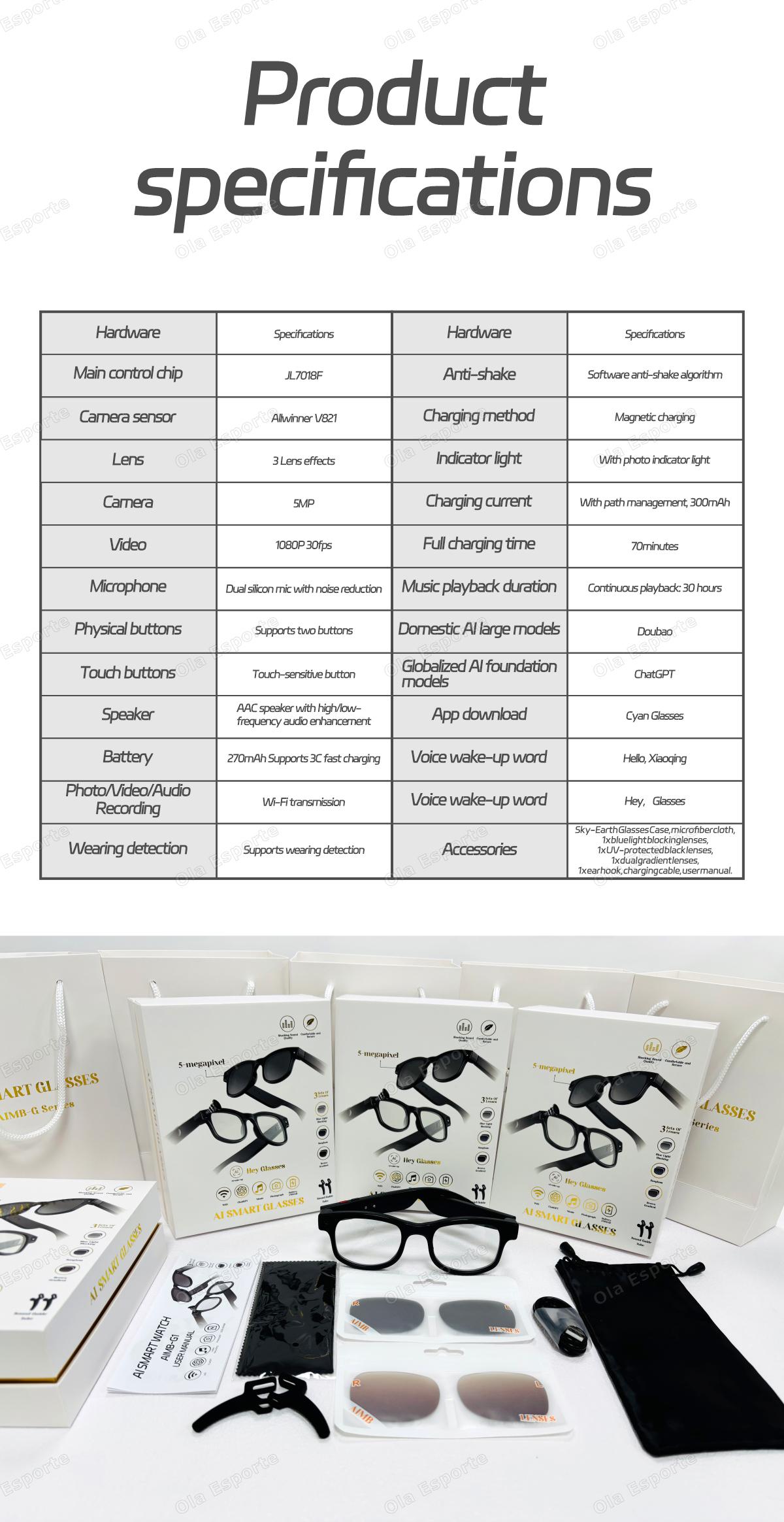 voice wake-up, music playback, music control, receiving calls, access to Chat GPT large model, look at the picture in kind, real-time translation, etc., shooting anti-shake, wifi transmission, dual-microphone noise reduction, single-point touch, Video recording, Photo taking, AI functions (ChatGPT, Image recognition, AI conversation, Translation), Audio recording and so on.