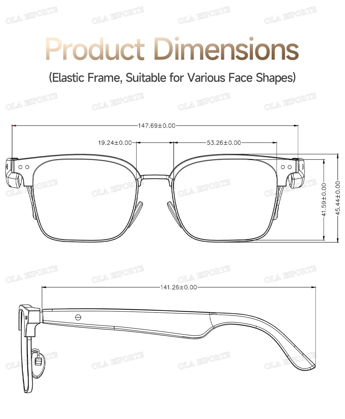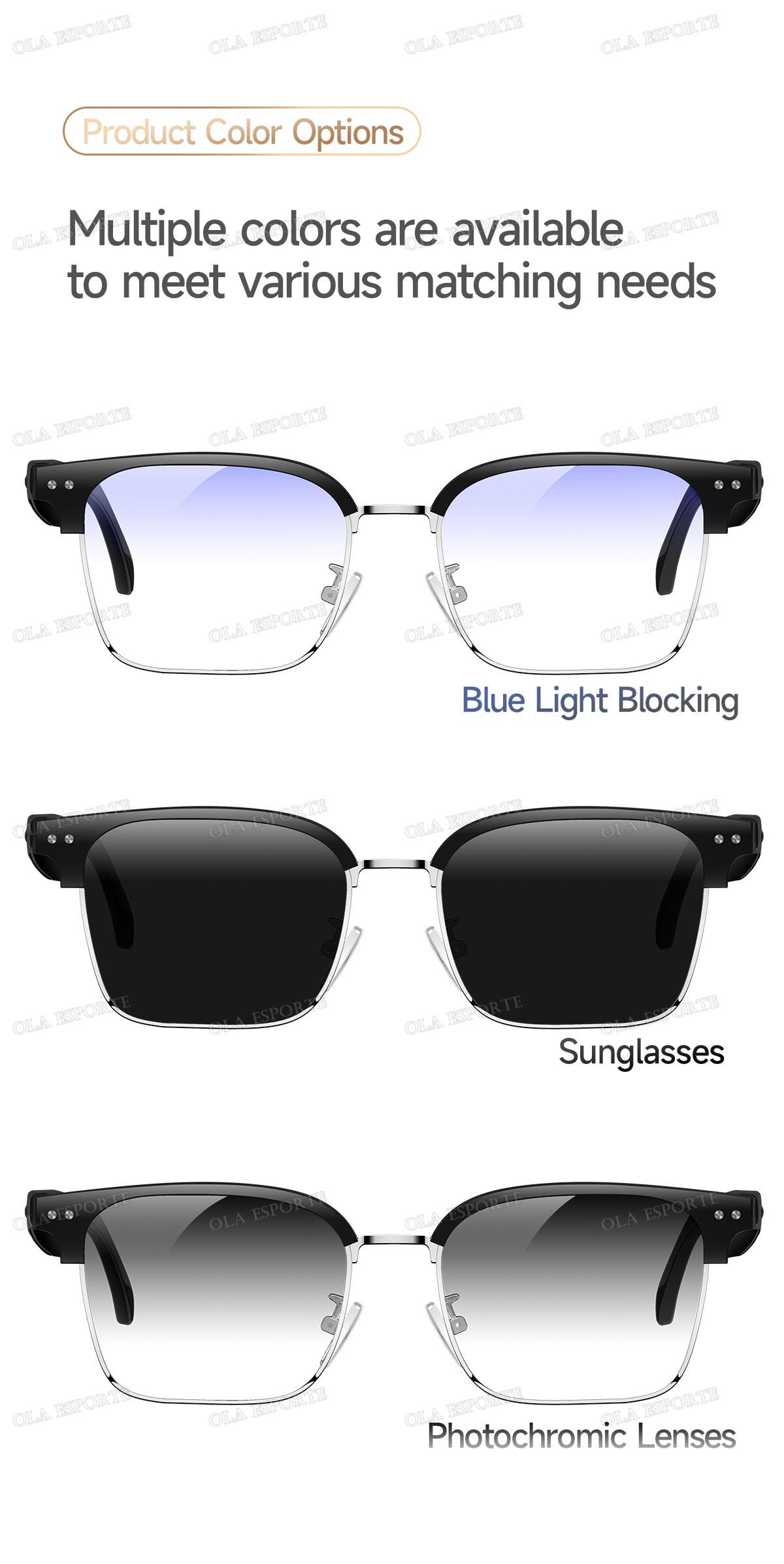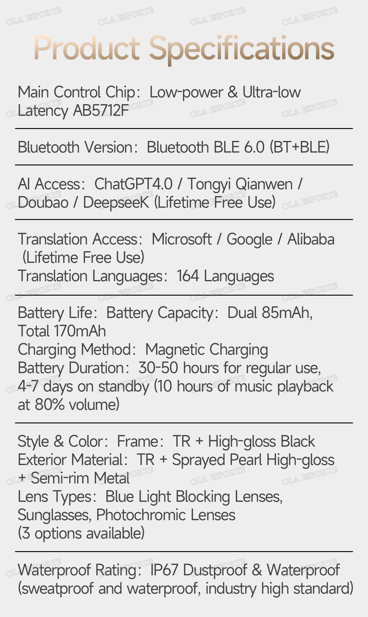 AI Bluetooth Audio Call Stylish Smart Glasses: AI intelligent voice and video real - time translation, AI dialogue Q&A, AI intelligent translation, simultaneous interpretation (translator mode, glasses + mobile phone translation mode. It can translate more than 164 languages), voice notes, sleep - aid mode, photo translation, remote - controlled photography, Bluetooth calling, smart Hall - effect sensor for automatic power on/off, smart voice assistant, music playback (supports music switching and pausing for music enjoyment), adopts low - power - consumption AB5712F chip, ENC (Environmental Noise Cancellation) noise reduction, ultra - low latency, long - lasting battery life, lightweight at 25g for imperceptible and extremely comfortable wearing, can be configured with various lenses such as sunglasses lenses, blue - light - blocking lenses, photochromic lenses, and myopia lenses.