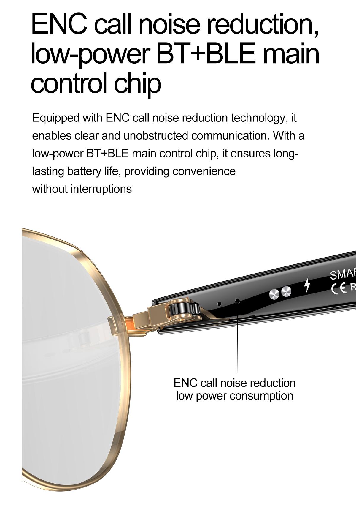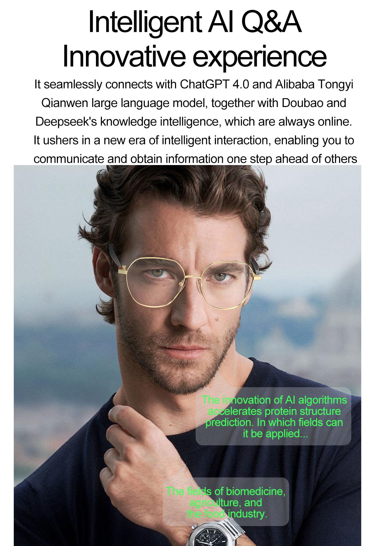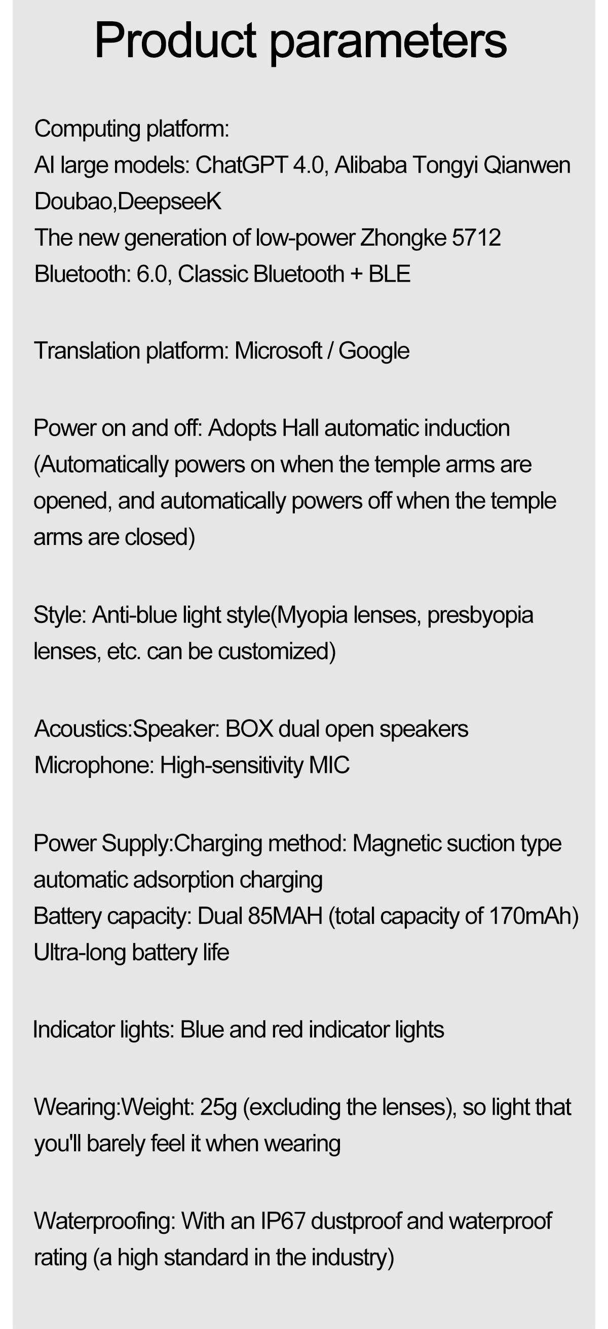 AI Bluetooth Audio Communication Fashion Smart Glasses: AI intelligent voice and video real-time translation, AI dialogue and Q&A, AI intelligent translation (translation machine mode, glasses+phone translation mode. Can translate more than 163 languages), voice note, sleep aid mode, photo translation, remote control photo, Bluetooth communication, intelligent Hall sensor automatic on/off, intelligent voice assistant, music playback (switching, pausing music appreciation), using low-power AB5712F chip, ENC noise reduction, ultra-low latency, long-lasting battery life, lightweight 25g, comfortable to wear, configurable sunglasses, blue light, close view and other lenses.