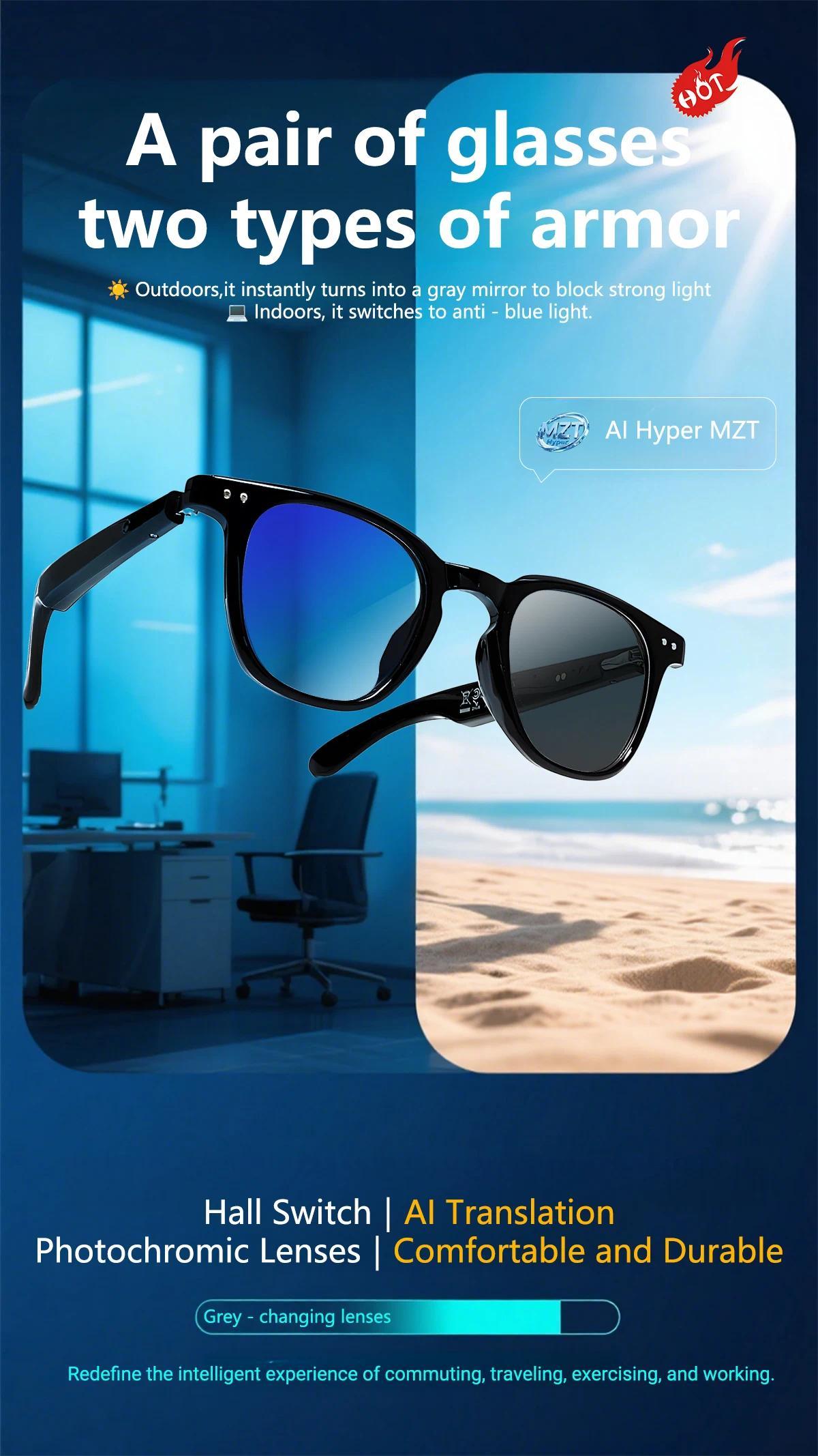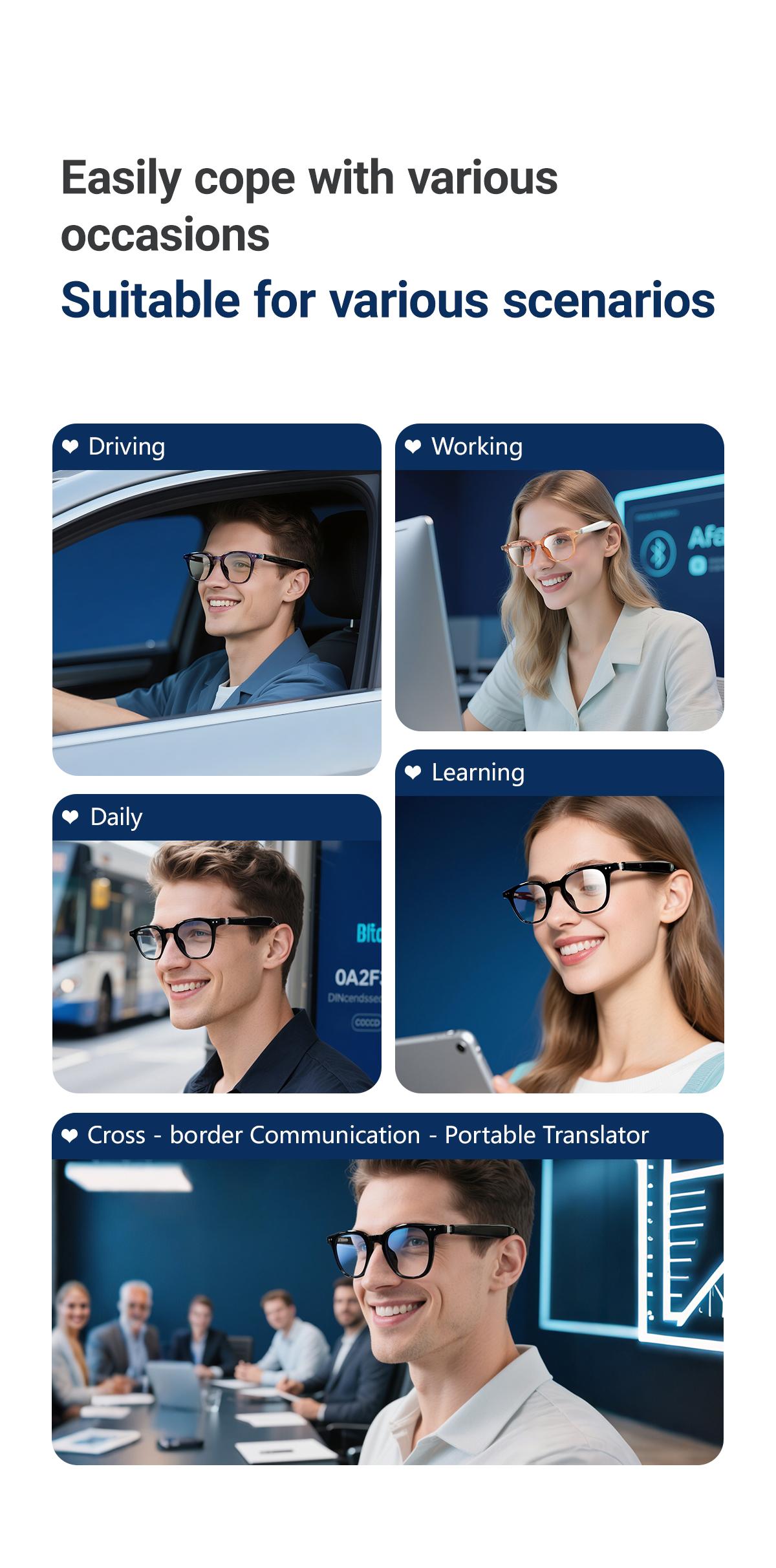 *AI Bluetooth Audio Call Fashion Smart Glasses: Equipped with functions such as AI intelligent voice and video real-time translation, AI dialogue and Q&A, AI intelligent translation (including translator mode and the translation mode combining glasses and mobile phone, which can customize the translation of more than 163 languages)