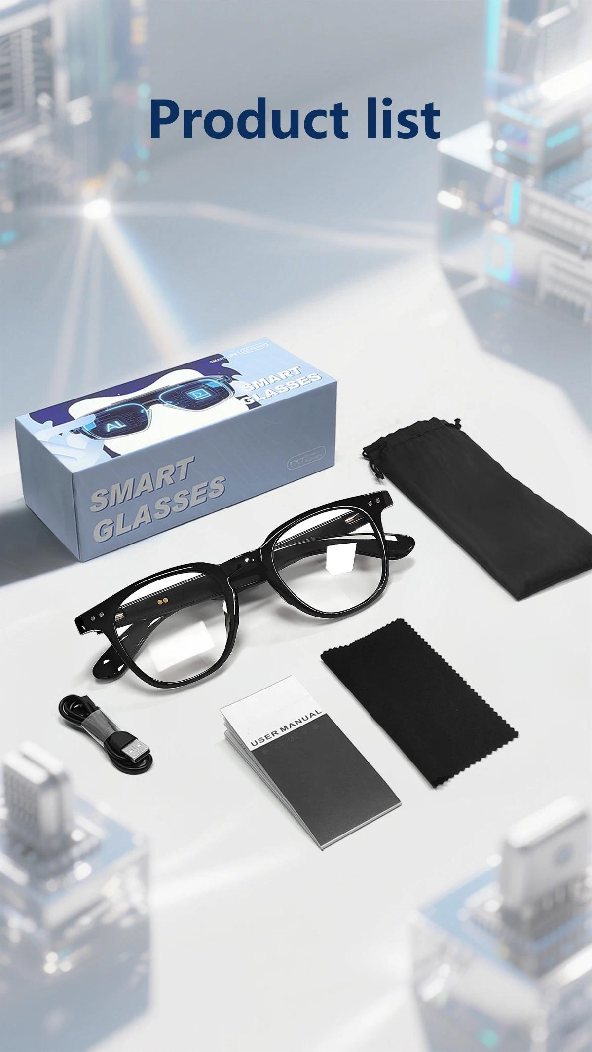 Glasses, glasses storage box, charging cable, user manual, APP user manual, glasses cloth, packaging box, silicone ear pads.