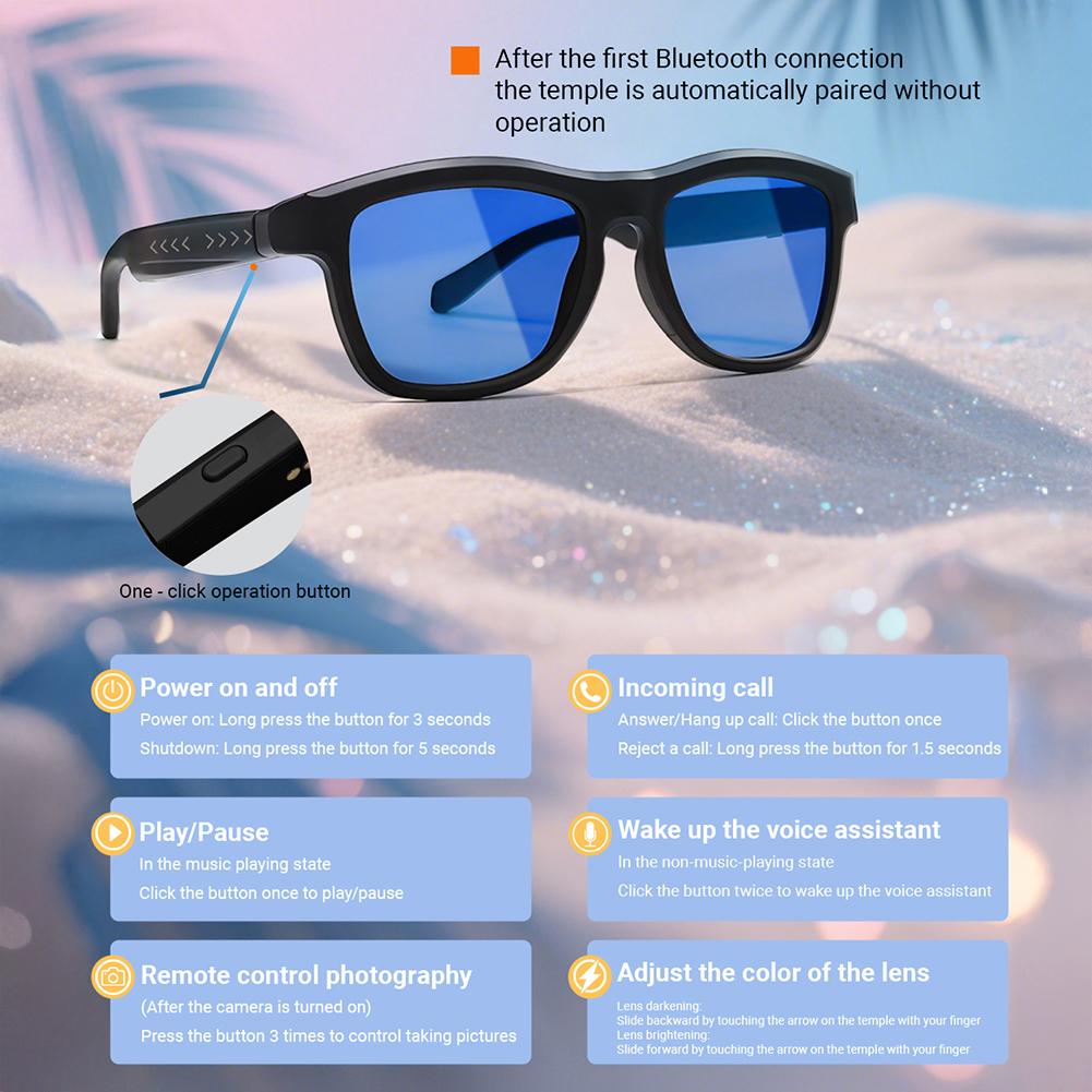 The Bluetooth glasses integrate multiple functions such as AI translation, calls, music playback, voice assistants, and remote photo taking, making them great helpers for outdoor sports and travel.