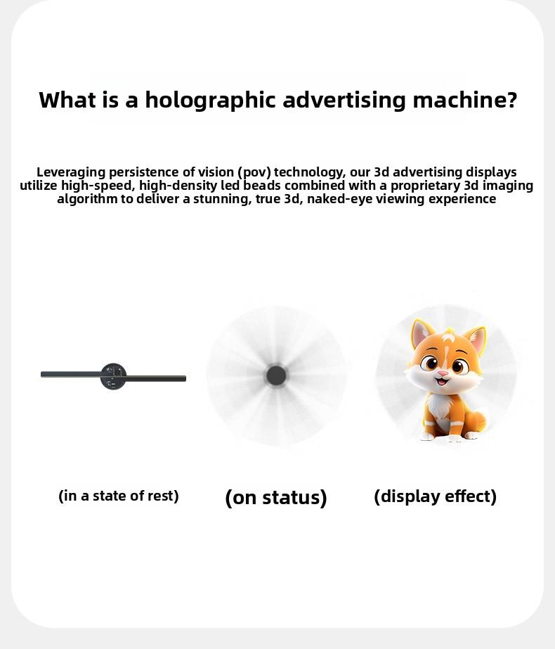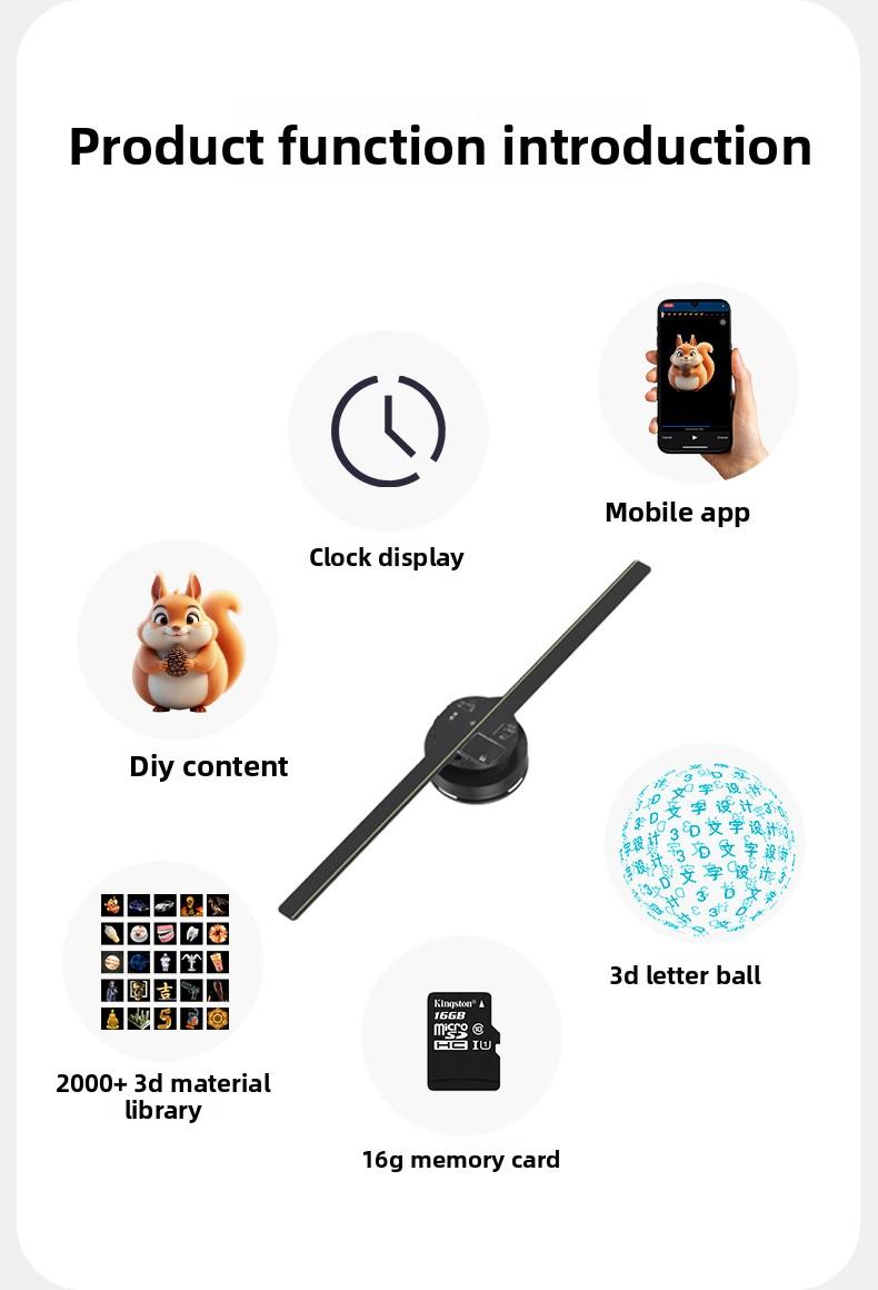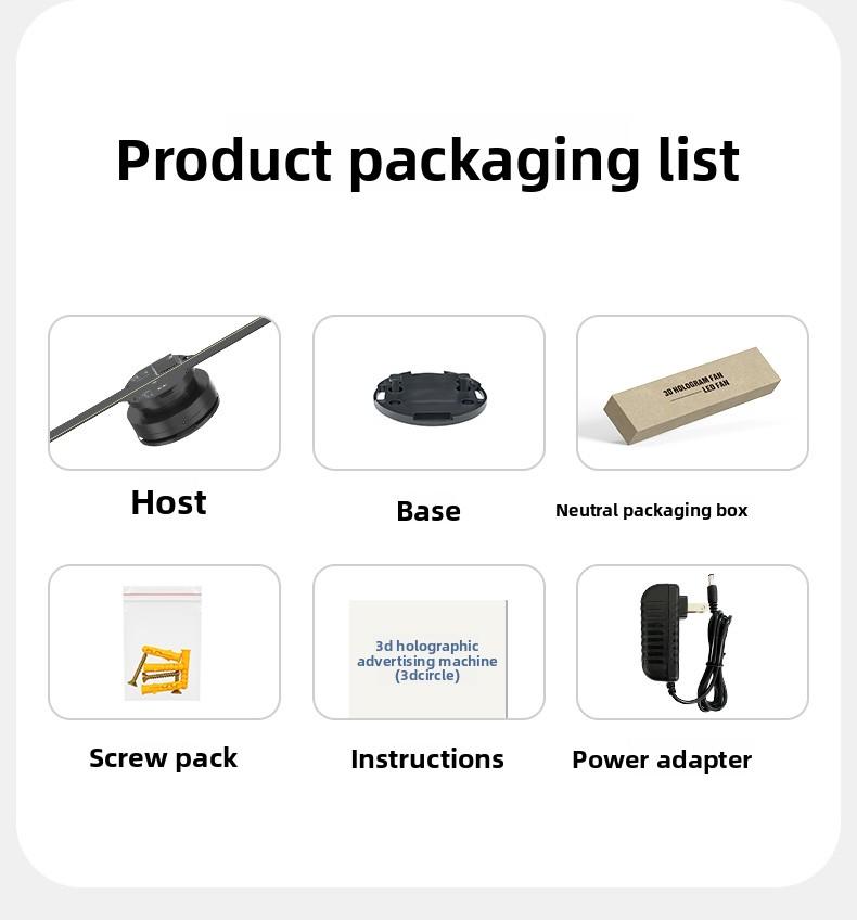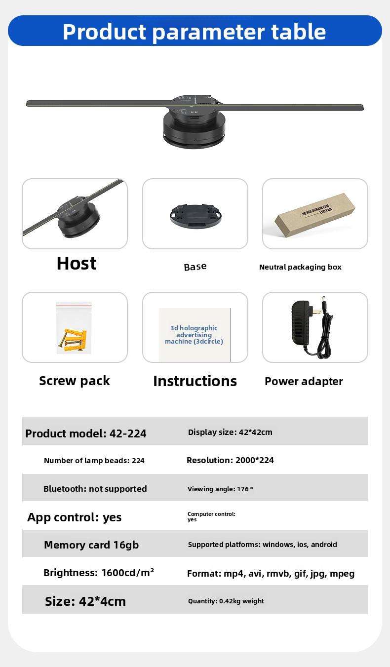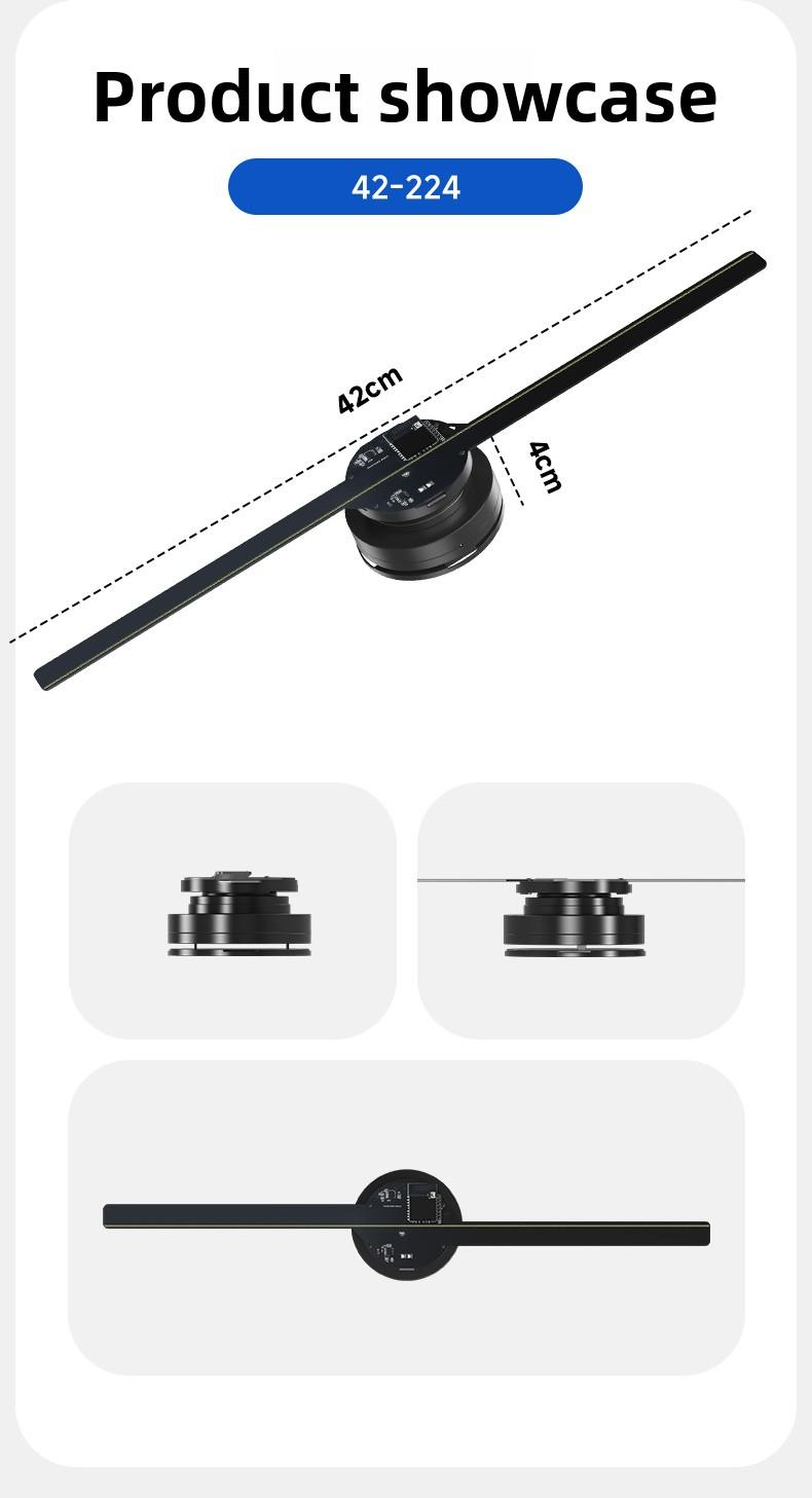 PD42 3D Holographic Projection Fan with WiFi Display for Commercial Advertising Holographic Bulb Projector with Replaceable Fan Blades PD42 Standard Edition Display Diameter (mm): 420*420 Resolution: 1024*640 LED Count: 224 Rated Power: 18W Power Supply Voltage: 12V 2A Remote Control (Multi-Functional) √ 16G TF Memory Card Software Support System: APP Brightness Adjustment √ Angle Adjustment √ Package Dimensions (mm): 46*11*7CM Package Weight (kg): 0.42