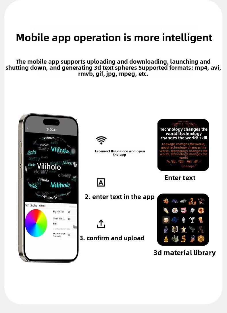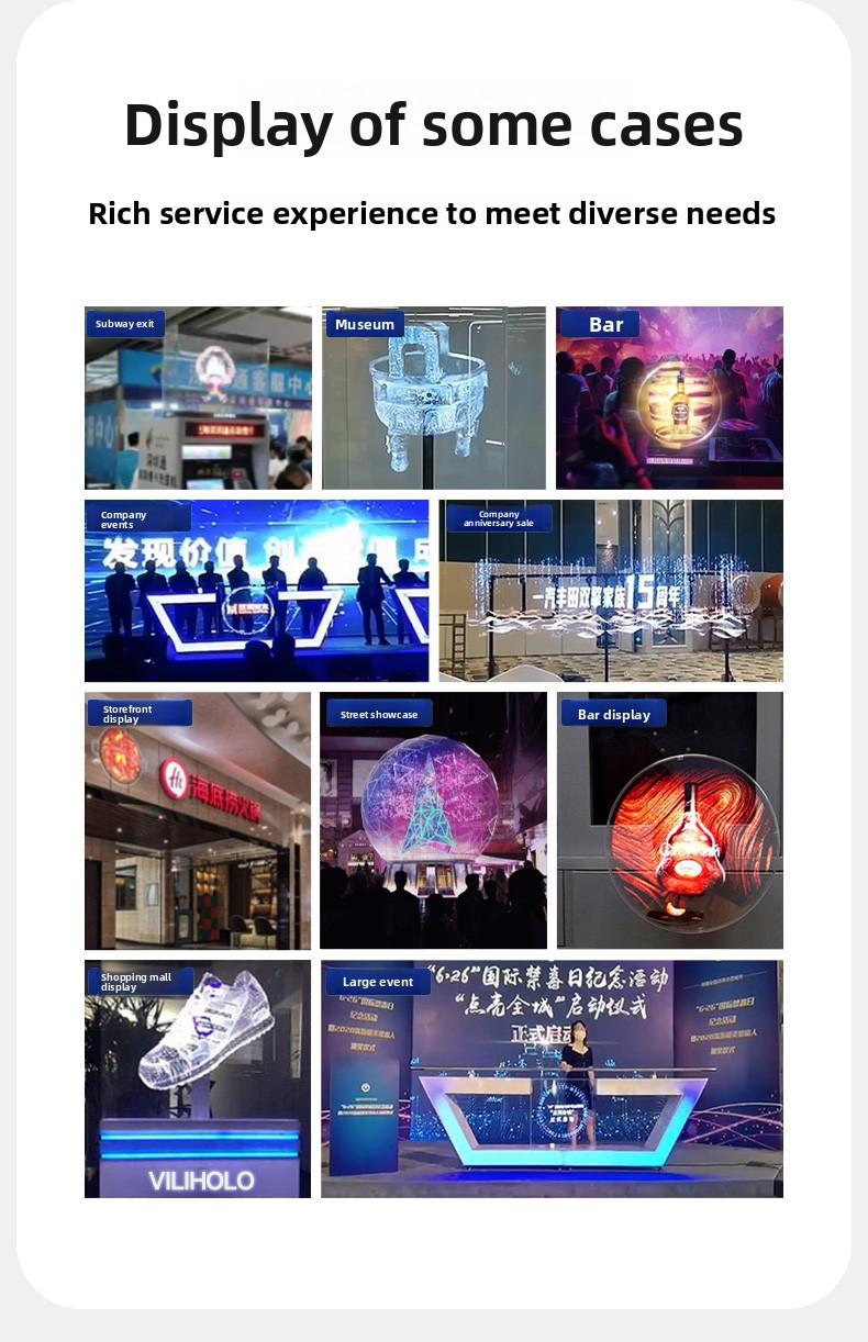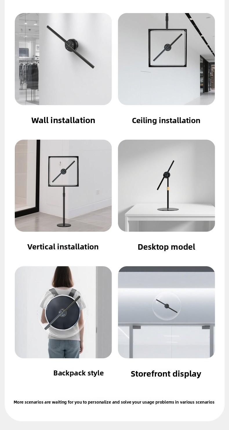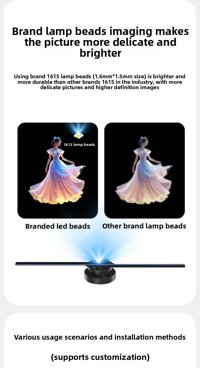 PD42 3D Holographic Projection Fan with WiFi Display for Commercial Advertising Holographic Bulb Projector with Replaceable Fan Blades PD42 Standard Edition Display Diameter (mm): 420*420 Resolution: 1024*640 LED Count: 224 Rated Power: 18W Power Supply Voltage: 12V 2A Remote Control (Multi-Functional) √ 16G TF Memory Card Software Support System: APP Brightness Adjustment √ Angle Adjustment √ Package Dimensions (mm): 46*11*7CM Package Weight (kg): 0.42